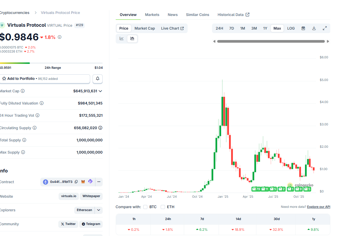 - Virtuals Protocol ecosystem valued at over $1Bn