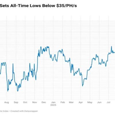Bitcoin’s hashprice has fallen to a new all-time low below $35 per petahash per second (PH/s), hit by the combination of bitcoin’s price drop and