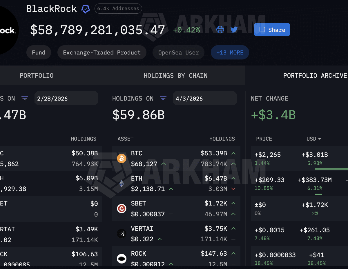 The BlackRock crypto fund currently holds approximately $53.39Bn in Bitcoin, according to the real-time wallet dashboard on Arkham Intelligence at the time of writing (April 3).