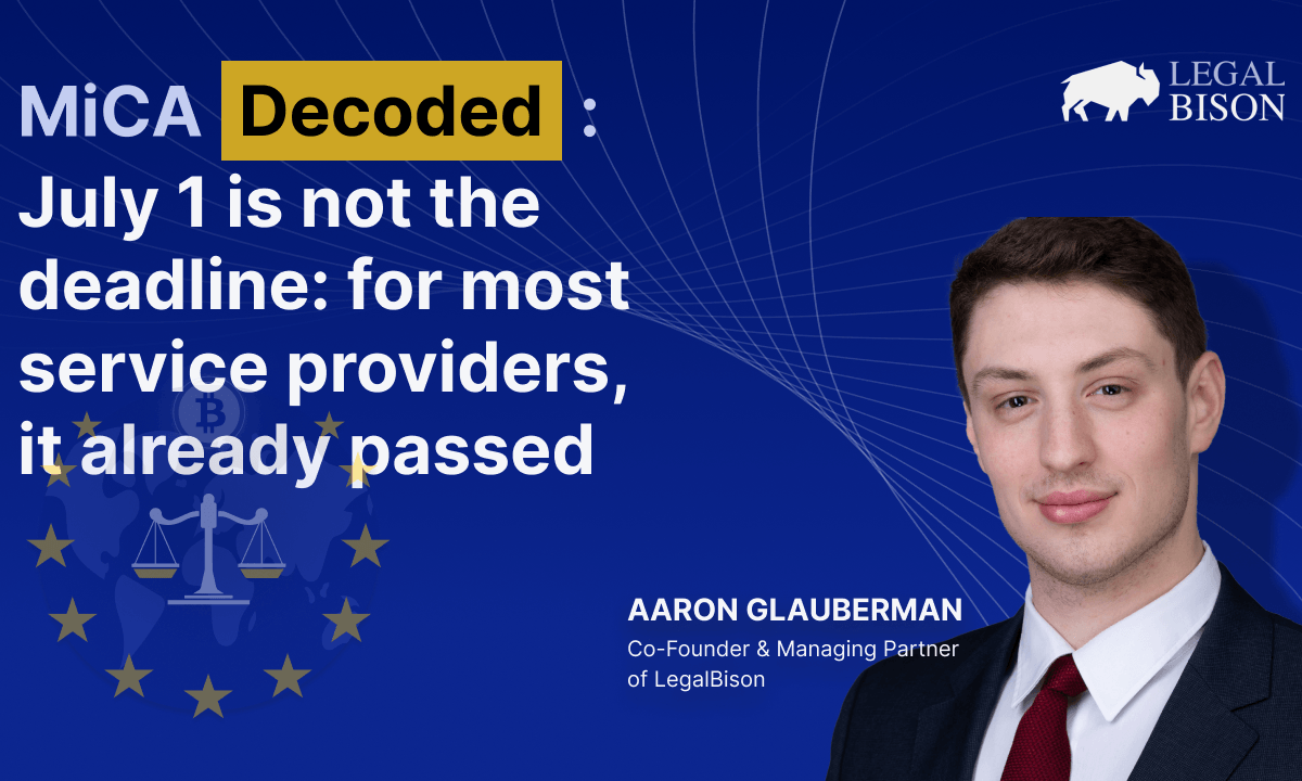 MiCA Decoded is a 12-article weekly series for Bitcoin.com News, co-authored by LegalBison’s Co-Founding and Managing Directors: Aaron Glauberman, Viktor Juskin and Sabir Alijev. LegalBison advises crypto and FinTech companies on MiCA licensing, CASP and VASP applications, and regulatory structuring across Europe and beyond.